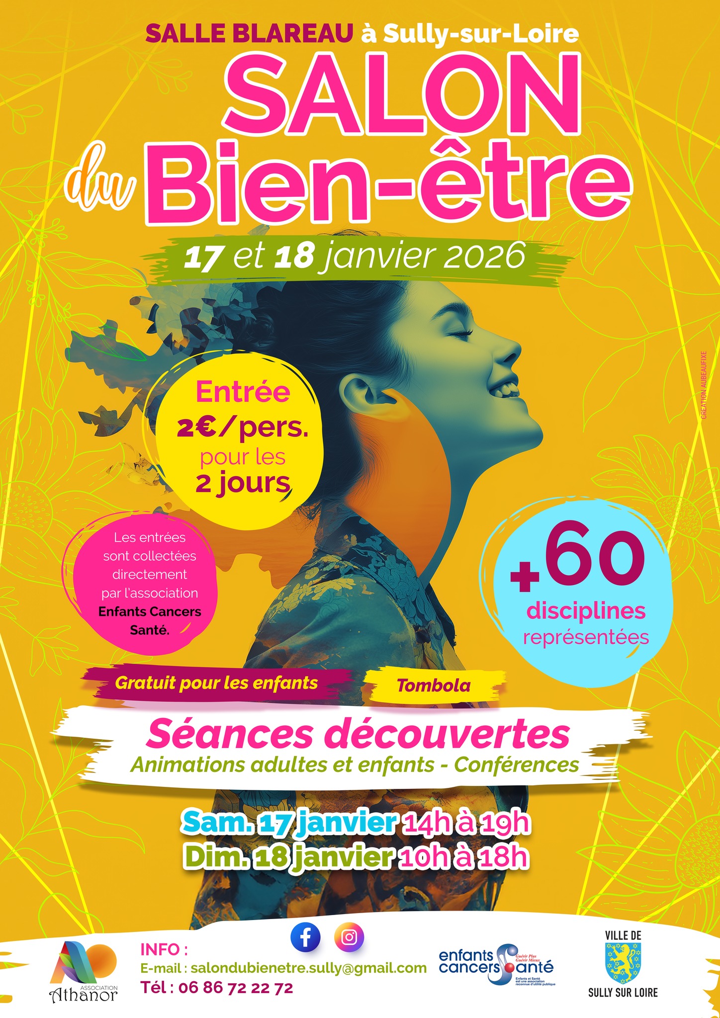 Plus de 60 disciplines représentées ; exposants et thérapeutes – Séances de découvertes – Animations adultes et enfants - Conférences - Tombola. ÉLA RECETTE DES ENTREES SERA INTEGRALEMENT REVERSÉE A L'ASSOCIATION ENFANTS CANCERS SANTÉ. - en partenariat avec la municipalité et Enfants cancer santé -