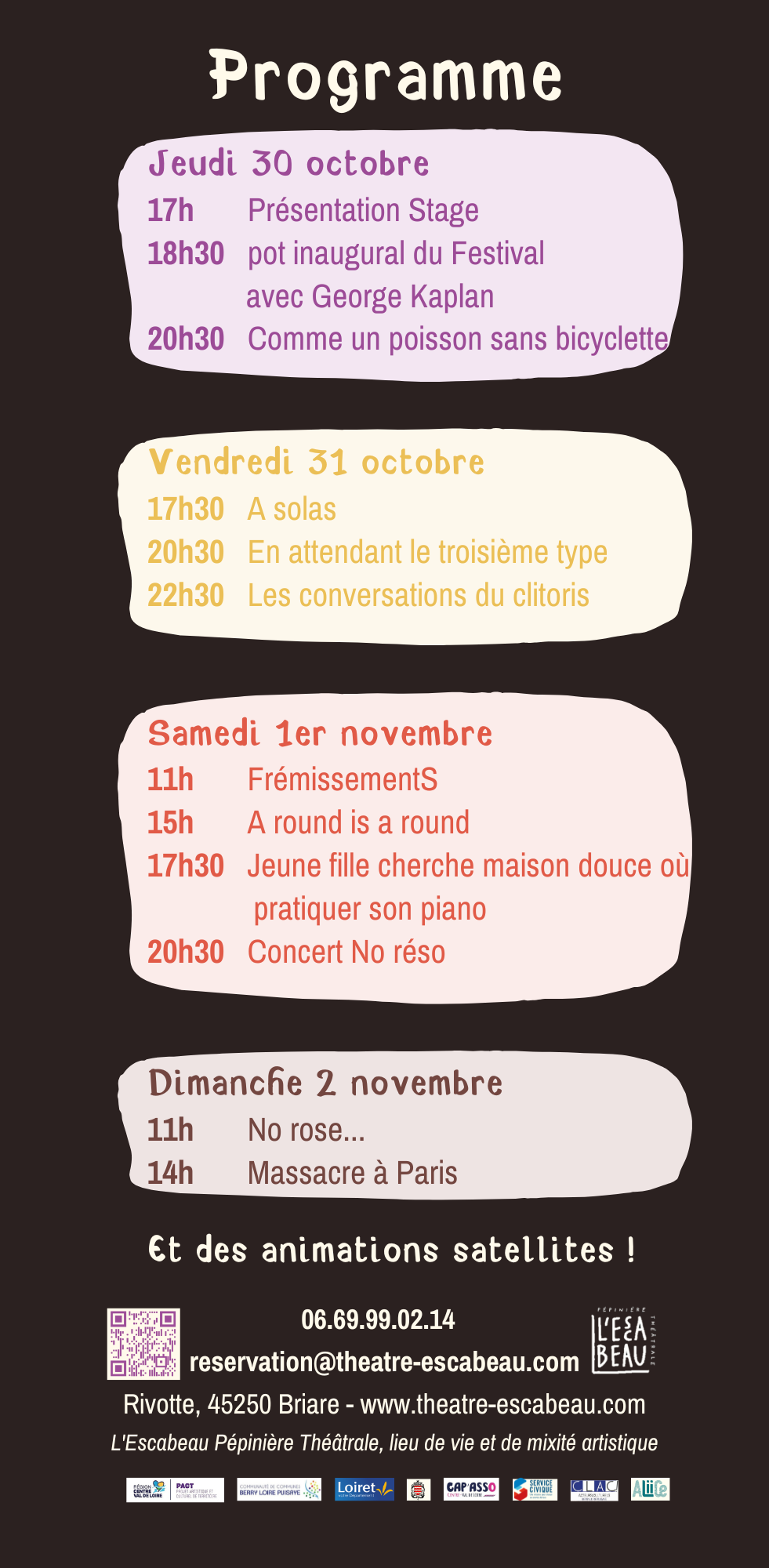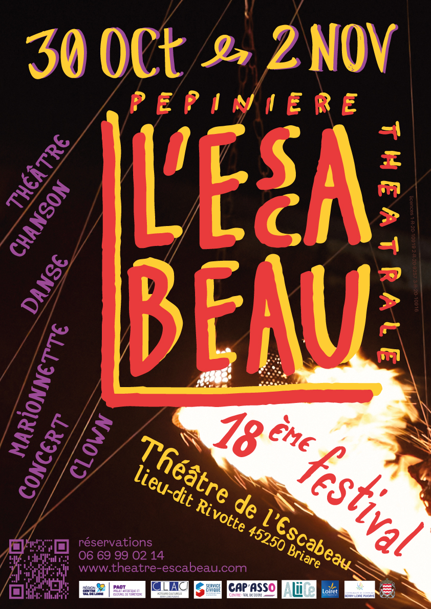 L’Escabeau vous convie à la 18ème édition de son Festival ! L’occasion de vous présenter des spectacles de grandes qualités, de la région et du reste de la France. Au cours des éditions précédentes, nous avons ainsi eu la joie et l’honneur d’accueillir des artistes tels que Sandra Nkaké, David Ayala, Carole Thibaut, Jean Guidoni, Virginie Lemoine, Johnny Montreuil et bien d’autres. Pendant 4 jours, nous vous proposons une programmation riche pour vous offrir de très beaux moments : théâtre, chansons, musique, lecture, marionnette et la possibilité de se restaurer sur place. Un rendez-vous à ne pas manquer ! Réservation en ligne : https://www.helloasso.com/associations/association-theatre-de-l-escabeau/evenements/18e-festival-de-l-escabeau