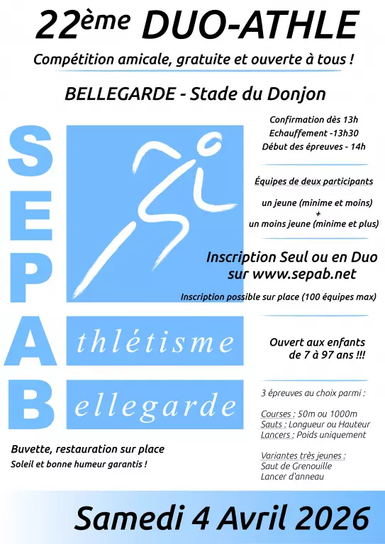 22ème Duo-Athlé, compétitions amicale, gratuite et ouverte à tous au donjon, confirmation à partir de 13h, échauffement : 13h30, 14h : début des épreuves, au stade du donjon. Gratuit, ouvert à tous. Buvette et restauration sur place. Inscriptions en ligne. (SEPAB).