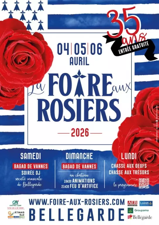 Venez découvrir lors de la 35ème foire aux rosiers de nombreuses variétés de roses et d'autres arbustes et plantes pour magnifier votre jardin ! 200 exposants sélectionnés pour leur savoir-faire et leur passion des jardins. Samedi : bagad de Vannes, soirée DJ. Dimanche : Bagad de Vannes, animations, feu d'artifice. Lundi : Chasse aux œufs, chasse aux trésors.