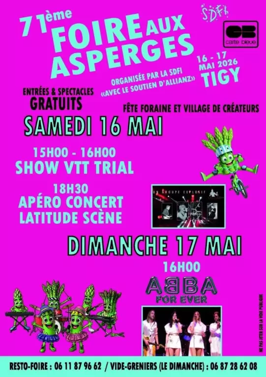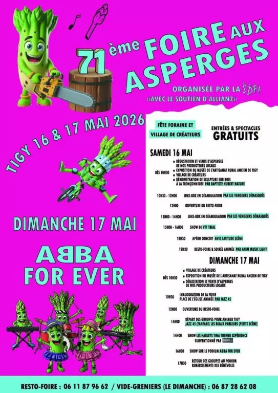Samedi 16 : dès 10h30, fête foraine et village de créateurs, dégustation et vente d'asperges, exposition du musée de l'artisanat rural ancien de Tigy, démonstration de sculpture sur bois à la tronçonneuse - 10h-12h Juke Box en déambulation - 12h Resto-foire (sur réservation) - 13h-14h Juke Box en déambulation - 15h-16h Show de VTT Trial - 18h30 apéro concert Latitude Scène - 19h30 Resto-foire & soirée animée par Anim Music Light. Dimanche 17 : dès 10h30, fête foraine et village de créateurs, dégustation et vente d'asperges, exposition du musée de l'artisanat rural ancien de Tigy, vide-greniers - 12h Resto-foire (sur réservation) - 14h départ des groupes de musiques (Jazz 45 & Les Beaux Parleurs) - 14h Show Les Harleys Tina Turner Expérience - à 16h Show de Abba Fer Ever.