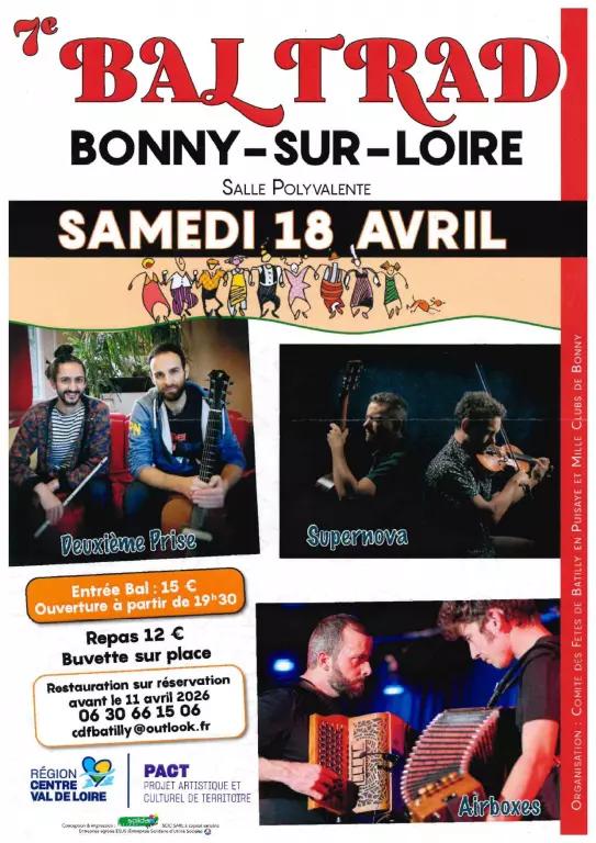 Le samedi 18 avril, la salle polyvalente de Bonny-sur-Loire accueille le 7e Bal Trad’, une grande soirée placée sous le signe de la musique et de la danse. Dès 20h, le duo « Deuxième prise » ouvre le bal avec un répertoire folk et trad aux accents du Berry. La soirée se poursuit avec Duo Supernova, qui propose une approche néo-trad énergique portée par le violon et la guitare, avant de se conclure avec le duo Airboxes, venu de Belgique, pour un voyage musical riche en rythmes et en émotions. Pensé pour les danseurs confirmés comme pour les débutants, le Bal Trad’ invite chacun à entrer dans la ronde sans pression, dans une ambiance bienveillante et conviviale. Une soirée festive où se mêlent découvertes, rencontres et plaisir de partager la musique.