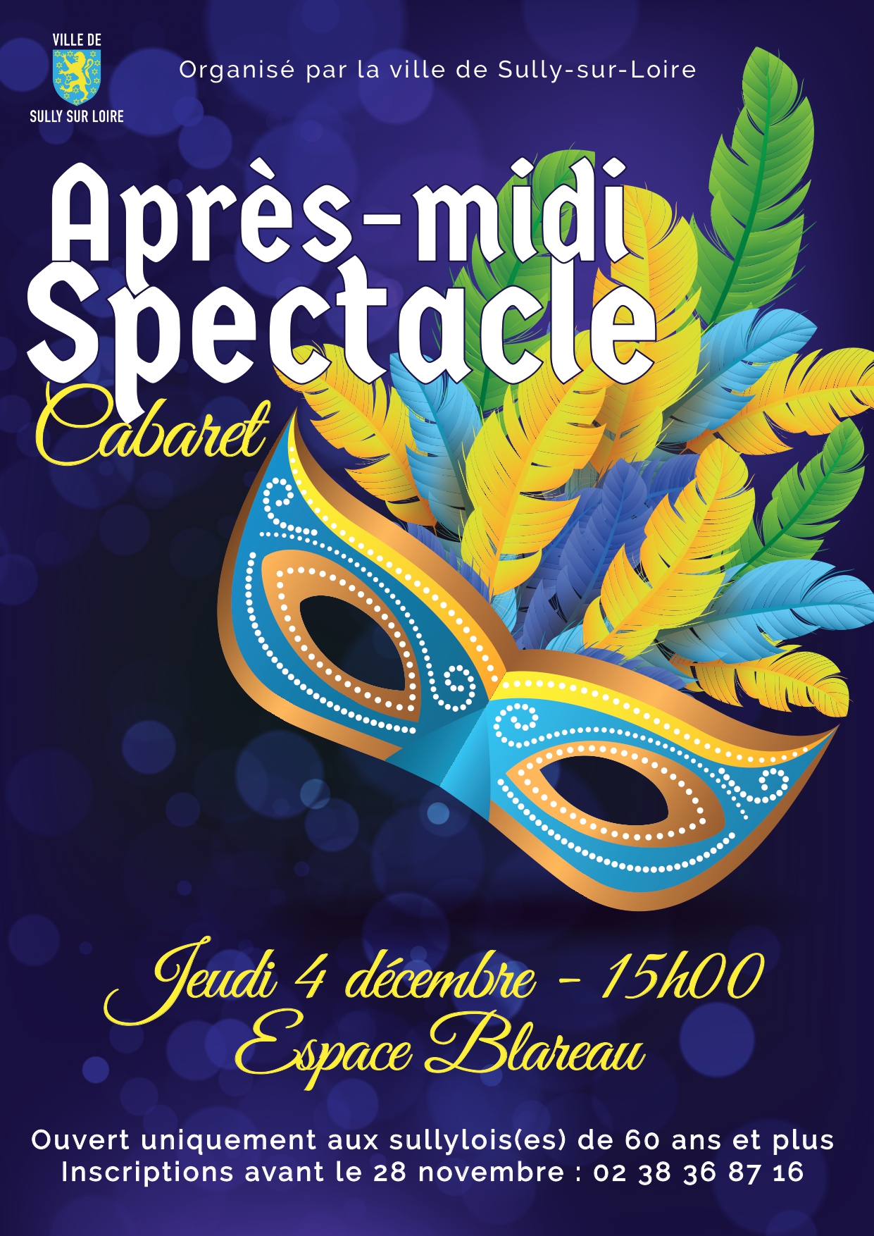 A l’occasion des fêtes de fin d’année, la municipalité organise un après-midi spectacle cabaret suivi d’un goûter. Spectacle est ouvert à tous les sullylois(es) de 60 ans et plus - sur inscription avant le 28 novembre auprès du CCAS.