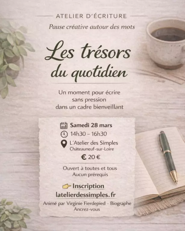 Et si vous vous accordiez un moment pour écrire, juste pour le plaisir ? Cet atelier de 2 heures propose une parenthèse douce et créative, ouverte à toutes et tous, sans prérequis, pour jouer avec les mots, réveiller son imaginaire et partager, si on le souhaite....