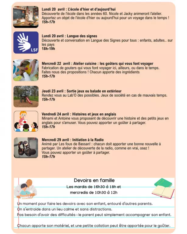 **Lundi 20 avril 15h-17h:** L’école d’hier et d’aujourd’hui Découverte de l’école dans les années 60. Nicole et Jacky animeront l’atelier. Apportez un objet de l’école d’hier ou aujourd’hui pour un voyage dans le temps ! **18h-19h** : Langue des signes Découverte et conversation en Langue des Signes pour tous : enfants, adultes.. sur les pays **Mercredi 22 avril 15h-17h :** Atelier cuisine : Les goûters qui vous font voyager. Fabrication de goûters d'ici, d'ailleurs, ou dans le temps. Faites nous des propositions ! Chacun apporte des ingrédients **Jeudi 23 avril** **15h-17h:** Sortie jeux ou balade en extérieur Rendez vous au Lab’O des possibles. Jeux de société en cas de mauvais temps. **Vendredi 24 avril 15h-17h** : Histoires et jeux en anglais Minami et An...