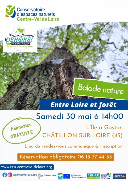 Le samedi 30 mai à 14h, partez pour une balade nature entre Loire et forêt à Châtillon-sur-Loire, au cœur de l’Île à Gaston. Proposée par le Conservatoire d’espaces naturels Centre-Val de Loire dans le cadre du mois de la biodiversité, cette animation gratuite vous invite à découvrir un site naturel remarquable, entre milieux ligériens et ambiance forestière. Au fil de la promenade, observez la richesse de la faune et de la flore locales, apprenez à mieux comprendre cet environnement préservé et laissez-vous guider dans une immersion au plus près de la nature. Une belle occasion de prendre l’air, d’ouvrir les yeux sur la biodiversité qui nous entoure et de profiter d’un moment ressourçant en pleine nature. Pensez à réserver, les places ne poussent pas spontanément comme les arbres.