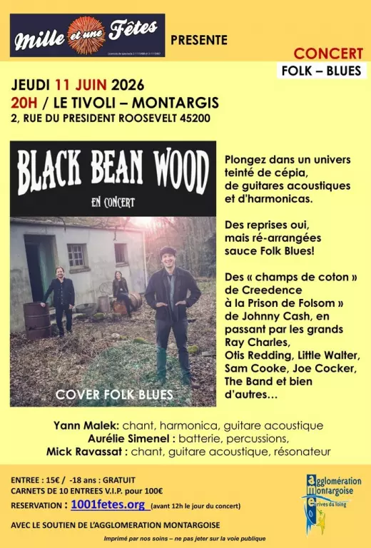 Plongez dans un univers teinté de cépia, de guitares acoustiques et d'harmonicas. Des reprises oui, mais ré-arrangées sauce Folk Blues! Des « champs de coton » de Creedence à la « Prison de Folsom » de Johnny Cash en passant par les grands Ray Charles, Otis Redding, Little Walter, Sam Cooke, Joe Cocker, The Band et bien d’autres… C’est Blues, c’est folk, c’est Black Bean Wood! (Bee gees, Creedence, Johnny Cash, Ray Charles, Michael Jackson, Ram Jam, Cotton Belly’s, Steevie Wonder, The Band, Allman Brothers band, Canned Heat, Nathaniel rateliff, Slim Harpo, Little Walter, Ben Harper, etc..) Yann Malek : chant, harmonica, guitare acoustique Aurélie Simenel : batterie, percussions, Mick Ravassat : chant, guitare acoustique, résonateur Réservation avec paiement en lign...