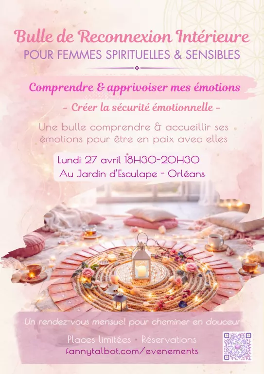 Cercle de femmes sensible & spirituelle - avec dimension énergétique – parcours progressif Ressentir beaucoup peut être une richesse… mais aussi parfois une source de fatigue ou de confusion intérieure. Le dimanche 27 avril, j’ouvre une nouvelle bulle de reconnexion intérieure pour les femmes sensibles qui souhaitent mieux comprendre leurs émotions et apprendre à les apaiser avec douceur. Ces bulles sont inspirées des cercles de femmes, avec une dimension énergétique et une progression au fil des mois (il est cependant possible de venir de façon ponctuelle). Un moment pour revenir à soi, se sentir comprise et repartir avec des outils concrets. Au programme\* : \- Accueil doux avec tisane et musique instrumentale \- Rituel d’ouverture de la bulle (respiration, a...