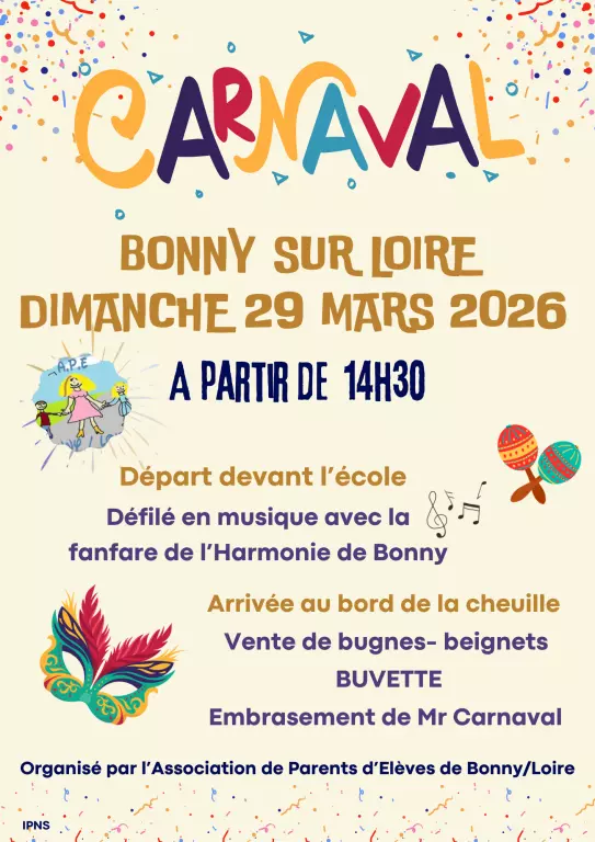 Rejoignez-nous pour un Carnaval haut en couleur à Bonny-sur-Loire le 29 mars dès 14h30 ! Au programme : démonstration de roliball, grand défilé festif au départ de l’école, puis animations au bord de la Cheuille avec une piñata pleine de surprises. Laissez-vous tenter par de délicieuses gourmandises : bugnes, beignets, pop-corn et boissons seront en vente pour régaler petits et grands. L’ambiance sera assurée par l’harmonie de Bonny-sur-Loire, qui accompagnera cette journée de fête en musique. Venez déguisés pour partager un moment convivial et joyeux en famille ou entre amis. Préparez vos plus beaux costumes et venez célébrer le Carnaval !