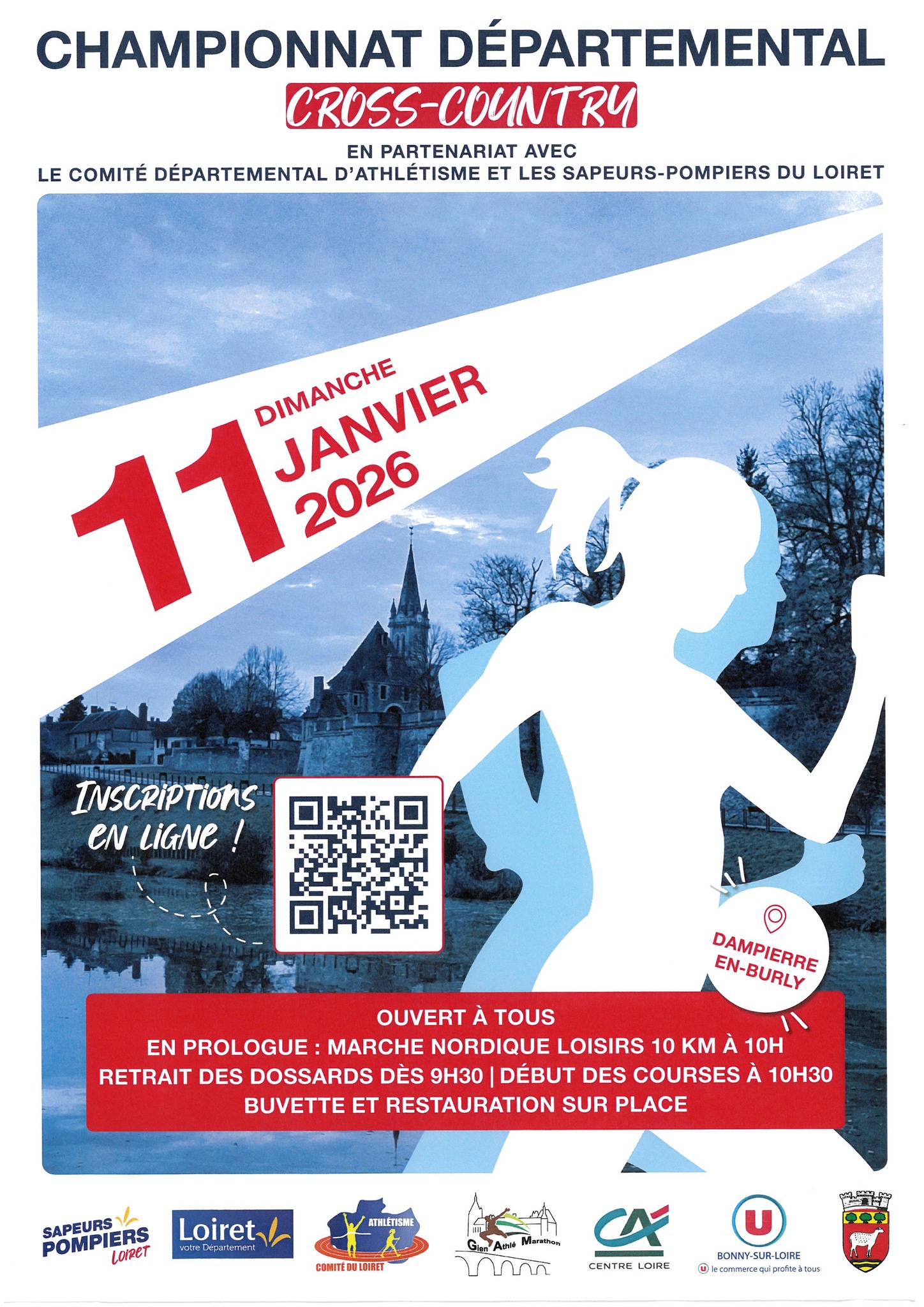 Championnats Départementaux de Cross ouvert à tous. * En prologue : Marche nordique loisirs (10km) | Retrait des dossards dès 9h30 | Début des courses à 10h30. Buvette et restauration sur place. * Disciplines proposées : Joëlette (4250m) - Bbenjamins, benjamines (2610m) - Minimes filles (3410m) - Minimes garçons (3810m) - Poussins, poussines (1410m) - Espoirs Femmes, Seniors Femmes, Masters Femmes (6920m) - Espoirs Hommes, Seniors Hommes, Masters Hommes (8610m) - Juniors Hommes (5810m) - Cadets Hommes & Juniors Femmes (4610m) - Cross Court Hommes et Femmes / Cadettes (4300m). * En partenariat avec le Comité Départemental d'Athlétisme et les Sapeurs-Pompiers du Loiret.