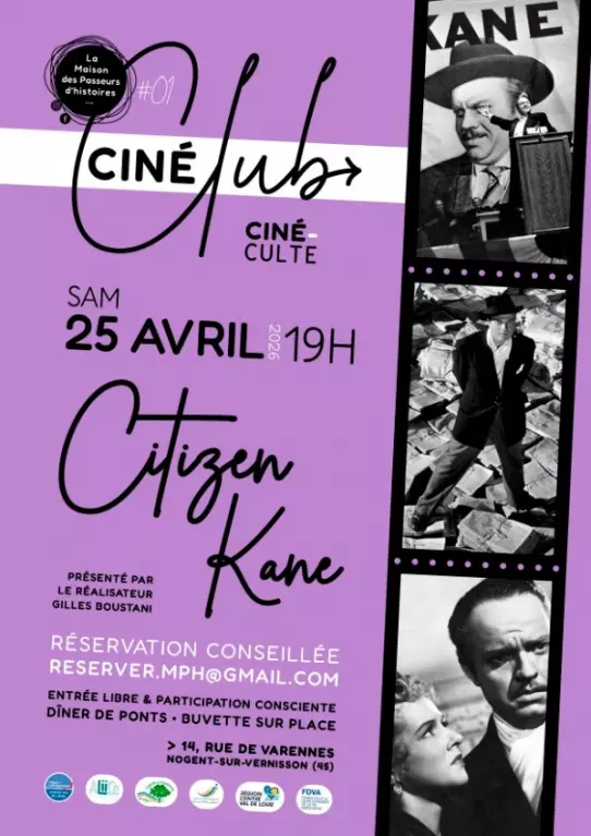 Ciné club à 19h. Citizen Kane Durée 1h59. Orson Welles. Participation libre. Dîner de ponts. buvette sur place.