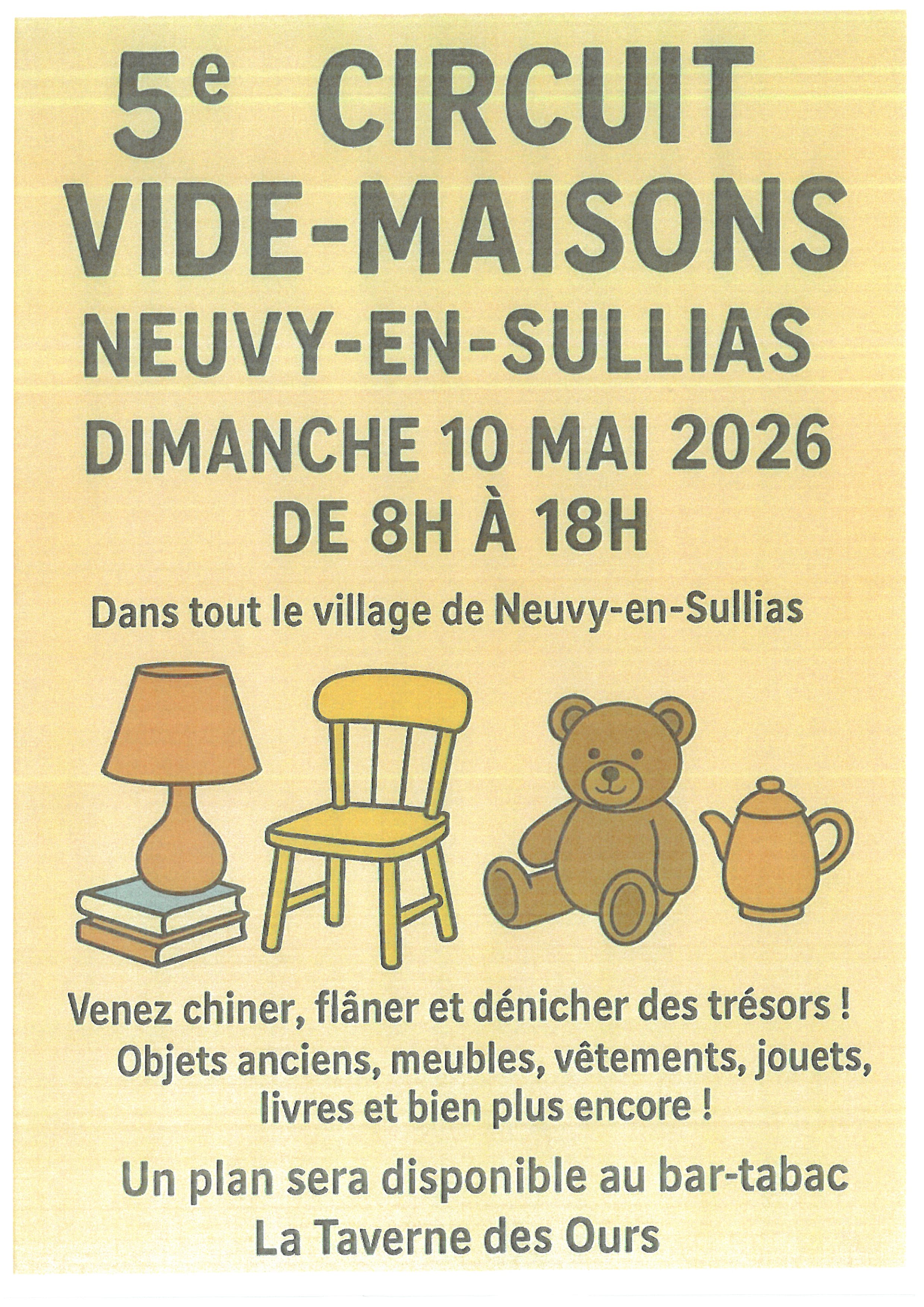 Un petit tour de Neuvy en Sullias à la recherche de trésors proposés par les videurs de maisons, le temps d’un dimanche ! Un plan sera disponible au bar-tabac "La Taverne des Ours". - par la municipalité -