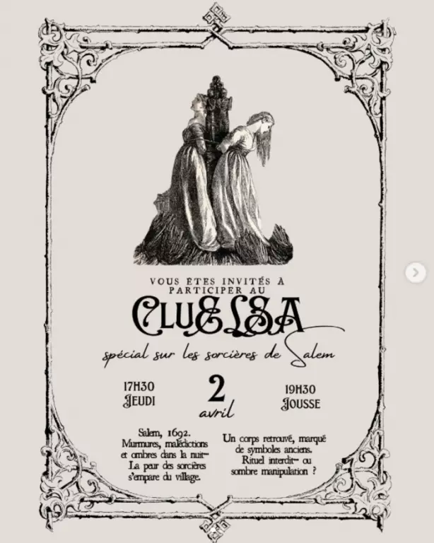 Salem, 1692. La peur des sorcières s’empare du village… et cette fois, elle a peut-être raison. Une jeune femme est retrouvée morte, entourée de symboles anciens. Très vite, les accusations fusent, les regards se durcissent, et les secrets remontent à la surface. Rituel interdit… ou mise en scène soigneusement orchestrée ? Dans un climat où la vérité se déforme et où chacun peut devenir coupable, une seule question demeure : à qui pouvez-vous vraiment faire confiance ? Enquêtez, accusez, manipulez… et tentez de découvrir ce qu’il s’est réellement passé avant qu’il ne soit trop tard. ️ Oserez-vous entrer dans le jeu ? Lien d'inscription : [https://docs.google.com/forms/d/e/1FAIpQLSeeSnc9AXTe7FVPln\_MFqZPgi-16e8zpw2stuD7GjBHzHlJrg/viewform](https://docs...