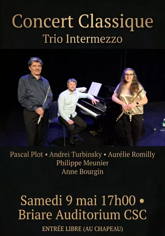 Le samedi 9 mai à 17h, l’Auditorium du CSC de Briare accueille un concert classique du Trio Intermezzo, pour un beau moment musical placé sous le signe de l’élégance et de l’émotion. Porté par des artistes talentueux, ce rendez-vous promet une parenthèse raffinée autour d’un répertoire classique interprété avec sensibilité. Dans l’ambiance intimiste de l’auditorium, laissez-vous guider par la richesse des sonorités et le plaisir de la musique en live, le temps d’un concert accessible à tous. Que vous soyez amateur de musique classique, mélomane curieux ou simplement en quête d’une sortie culturelle à Briare, ce concert est une belle occasion de profiter d’un instant suspendu, entre virtuosité, partage et émotions. L’entrée est libre, au chapeau.