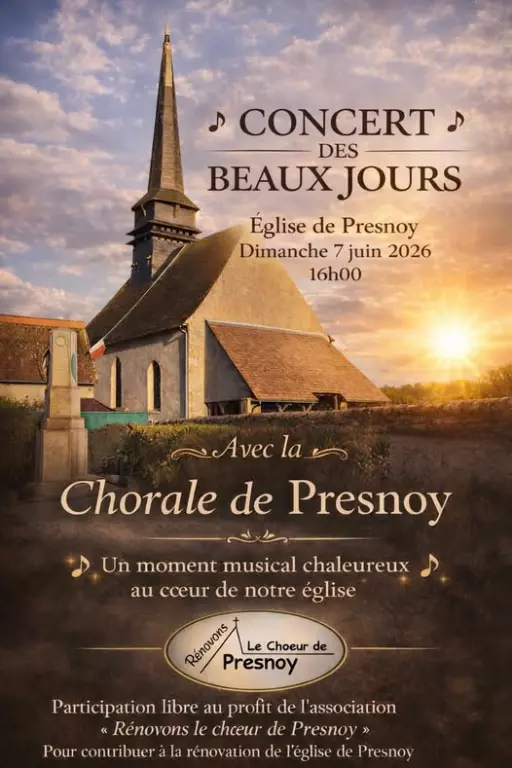 Concert des beaux jours avec la chorale de Presnoy. A 16h. Participation libre au profit de l'association "Rénovons le chœur de Presnoy" pour contribuer à la rénovation de l'église de Presnoy