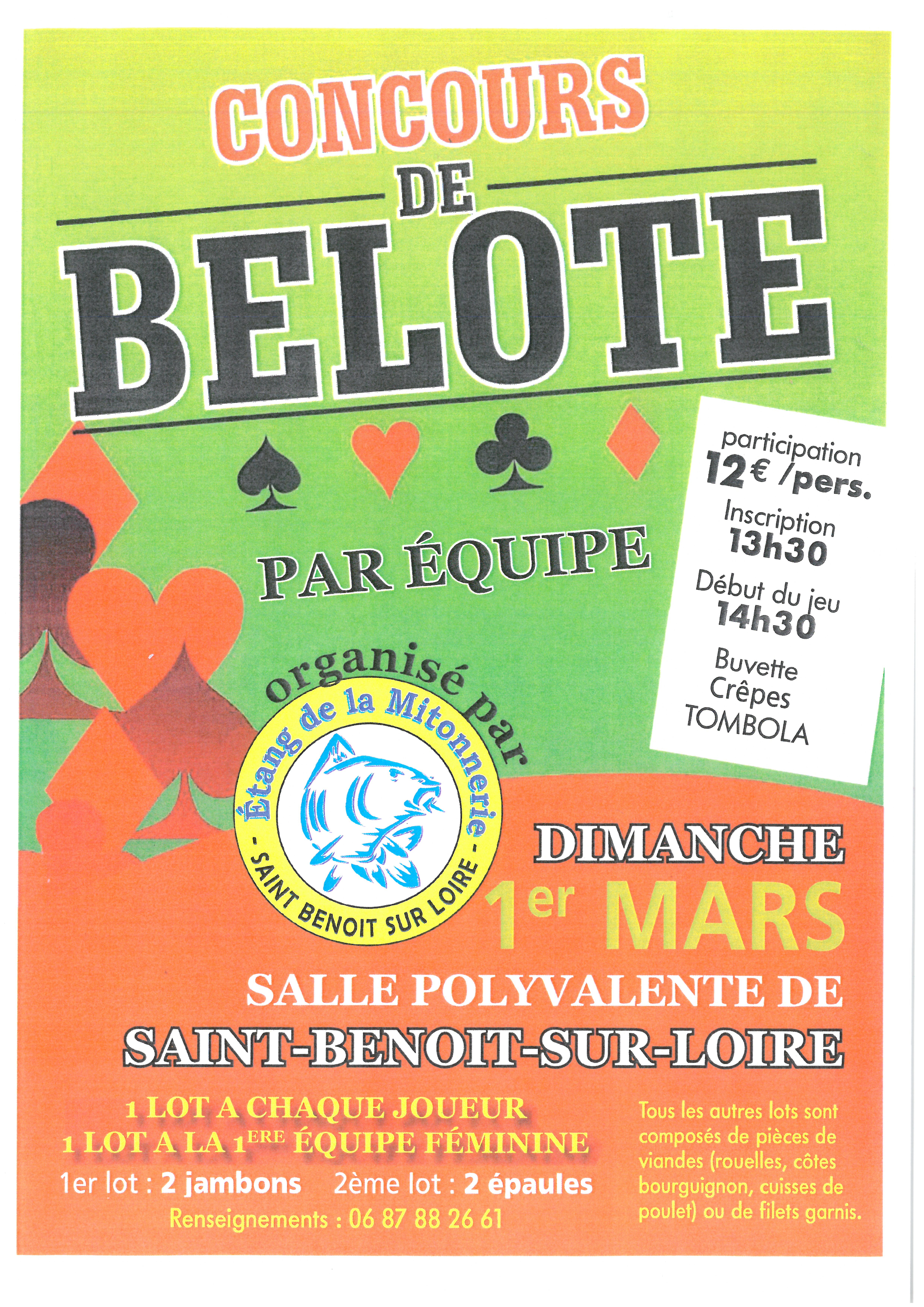 1 lot à chaque joueur | 1 lot pour la première équipe féminine | 1er lot : 2 jambons | 2è lot : 2 épaules | Tous les autres lots sont composés de pièces de viandes ou de filet garnis | Buvette et Crêpes - Tombola. - 13h30 inscriptions | 14h30 début du jeu - - par l'étang de la Mitonnerie -