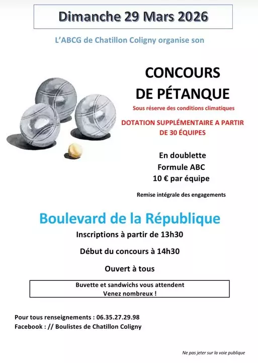 Concours de pétanque à 13h30, début du concours à 14h30. Ouvert à tous. En doublette, formule ABC. 10€ par équipe. Buvette et sandwichs. Renseignements : 06 35 27 29 98