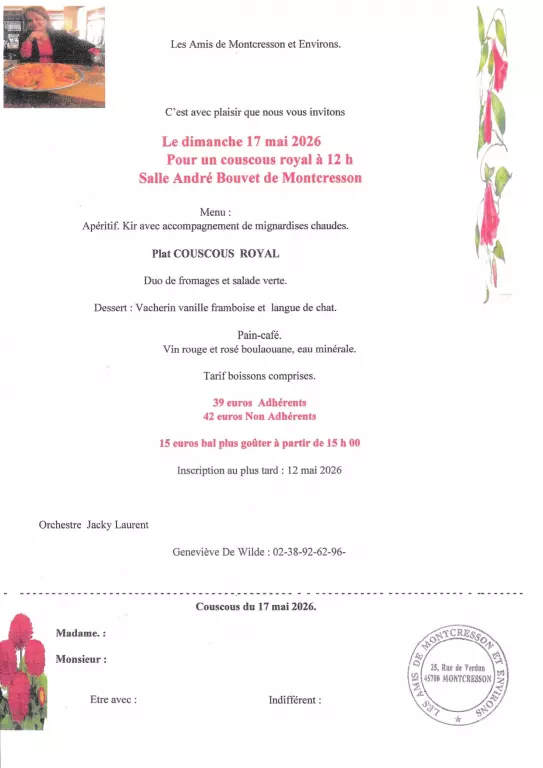 Couscous royal à 12h. Inscription au plus tard le 12 mai. Tarif repas : 39€ pour les adhérents et 42€ pour les non adhérents. Bal + goûter à partir de 15h : 15€. Orchestre Jacky Laurent.