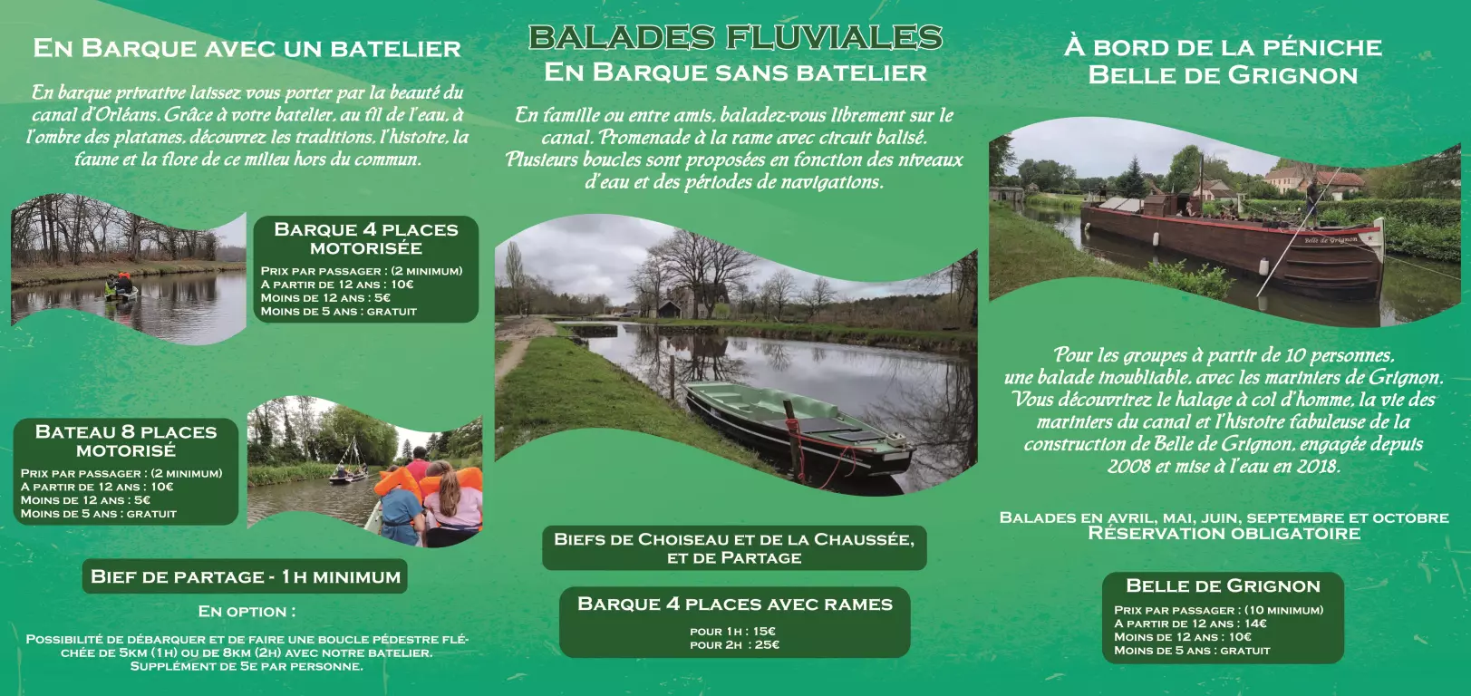 Découverte en barque avec un batelier, balades fluviales en barque sans batelier, ou à bord de la péniche "Belle de Grignon". Découvrez aussi en visite guidée ou non, le chantier fluvial du coche d'eau.