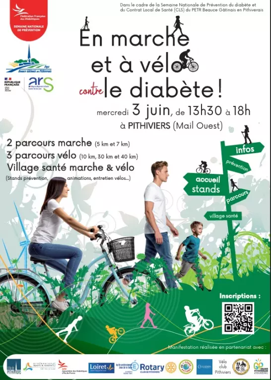 La ville de Pithiviers se mobilise pour la santé ! Le mercredi 3 juin, de 13h30 à 18h, le Mail Ouest accueille l’événement « En marche et à vélo contre le diabète ». Cette manifestation sportive et solidaire s'adresse à tous les niveaux avec deux parcours de marche (5 km et 7 km) et trois circuits cyclo (10 km, 30 km et 40 km). Au-delà de l'effort physique, un véritable Village santé attend les visiteurs. Des professionnels proposent des stands de prévention, des animations thématiques et un service d'entretien pour les vélos. Organisée dans le cadre de la Semaine Nationale de Prévention du diabète, cette journée allie convivialité et sensibilisation au cœur du territoire Beauce Gâtinais. L'inscription s'effectue directement via le QR code disponible sur l'affiche. Venez bouger pour votre