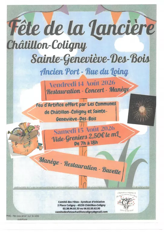 Fête de la lancière. Vendredi : restauration, concert, manège, feu d'artifice. Samedi : Vide grenier de 7h à 18h.. Restauration et buvette sur place, manège.