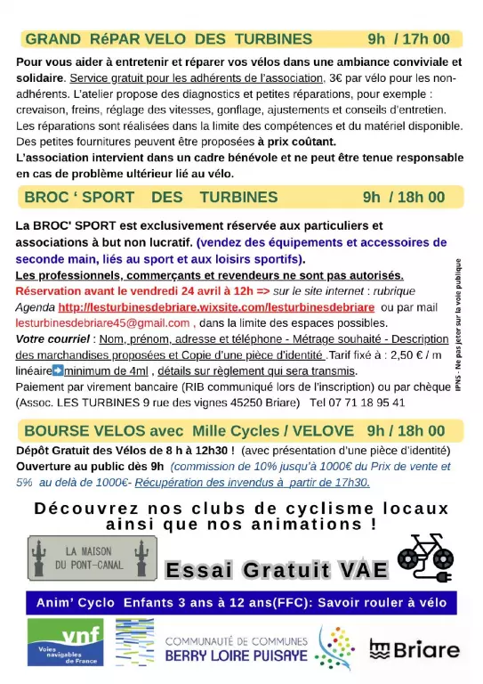 Rendez-vous le samedi 25 avril à la Maison des Turbines de Briare pour la Grande Journée Repair Vélo ! Amateurs de cyclisme, bricoleurs ou simples curieux, venez profiter d’un événement dédié à la réparation et à la seconde vie des vélos. Au programme : une bourse aux vélos d’occasion pour acheter ou vendre votre deux-roues, ainsi qu’une brocante, une découverte du VAE et des animations cyclo pour petits et grands. Une journée conviviale pour échanger, apprendre et redonner un coup de jeune à votre vélo. Que vous soyez passionné ou novice, c’est l’occasion idéale de donner une nouvelle vie à vos vélos ! Buvette et restauration sur place. Venez nombreux !