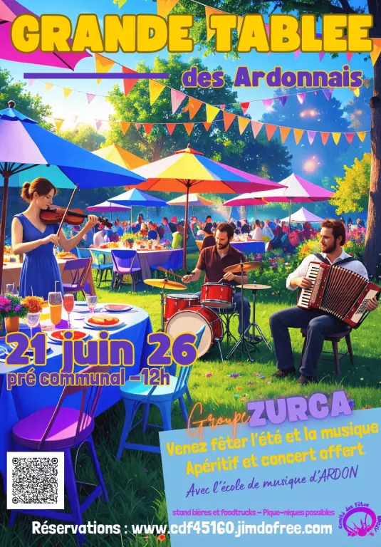 🎉 Grande tablée des Ardonnais 🎶 📅 Dimanche 21 juin 2026 🕛 À partir de 12h 📍 Pré communal • Ardon Envie de partager un moment convivial et festif en plein air ? Ne manquez pas la Grande tablée des Ardonnais ! Au programme : 🍹 Apéritif offert 🎶 Concert avec le groupe ZURCA 🎵 Participation de l’école de musique d’Ardon 🍔 Stands, foodtrucks et pique-niques possibles Un rendez-vous idéal pour célébrer l’été dans une ambiance chaleureuse et musicale 🌞 👉 Pensez à réserver : https://www.helloasso.com/associations/comite-des-fetes-ardon/evenements/2026-la-grande-tablee-des-ardonnais-2