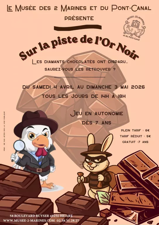 Du 4 avril au 3 mai 2026, le Musée des 2 Marines et du Pont-Canal à Briare vous invite à participer à « Sur la piste de l’Or Noir », un jeu d’enquête à vivre en autonomie dès 7 ans. Les diamants chocolatés ont disparu… et c’est à vous de mener l’enquête pour les retrouver. Au fil du parcours, petits et grands devront observer, réfléchir et résoudre des énigmes pour avancer dans cette aventure ludique. Une activité idéale à partager en famille, mêlant découverte, réflexion et plaisir du jeu dans un cadre culturel. Accessible tous les jours de 14h à 18h, ce jeu propose une manière originale de visiter le musée tout en s’amusant. Une expérience immersive à vivre au cœur de Briare, pour les apprentis détectives en quête de mystère.