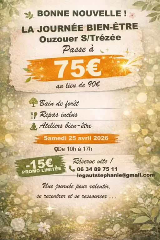 Le samedi 25 avril, offrez-vous une parenthèse de bien-être à Ouzouer-sur-Trézée, pensée pour ralentir, respirer et se reconnecter à l’essentiel 🌿 De 10h à 17h, cette journée vous propose un programme complet mêlant bain de forêt, ateliers bien-être et repas inclus, dans une ambiance douce et apaisante. Tout est réuni pour vous permettre de relâcher la pression du quotidien, prendre soin de vous et vivre un moment de recentrage au contact de la nature. Que vous veniez pour vous accorder une pause, découvrir de nouvelles pratiques ou simplement profiter d’une journée ressourçante, ce rendez-vous promet un vrai temps pour soi, placé sous le signe de la sérénité et du mieux-être.