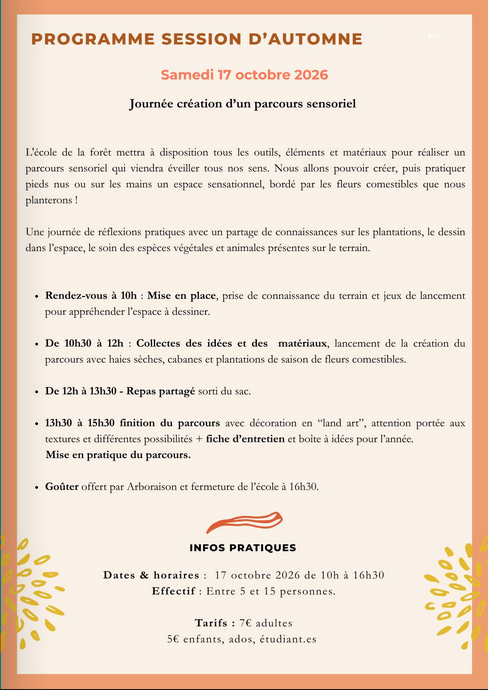 Le samedi 17 octobre 2026, Arboraison vous propose une journée immersive dédiée à la création d’un parcours sensoriel en pleine nature. Au cœur de la forêt, les participants sont invités à imaginer, concevoir et aménager un espace stimulant les sens, en utilisant des matériaux naturels et des éléments du terrain. La journée alterne temps de réflexion, collecte d’idées et de matériaux, phases de création et mise en pratique. Au programme : exploration du site, création de structures végétales, travail autour des textures et des formes, ainsi qu’un temps d’échange autour des pratiques liées aux plantations et au soin du vivant. Accessible à tous, cette expérience collective permet de partager un moment créatif et pédagogique, tout en se reconnectant à la nature et à ses sensations.