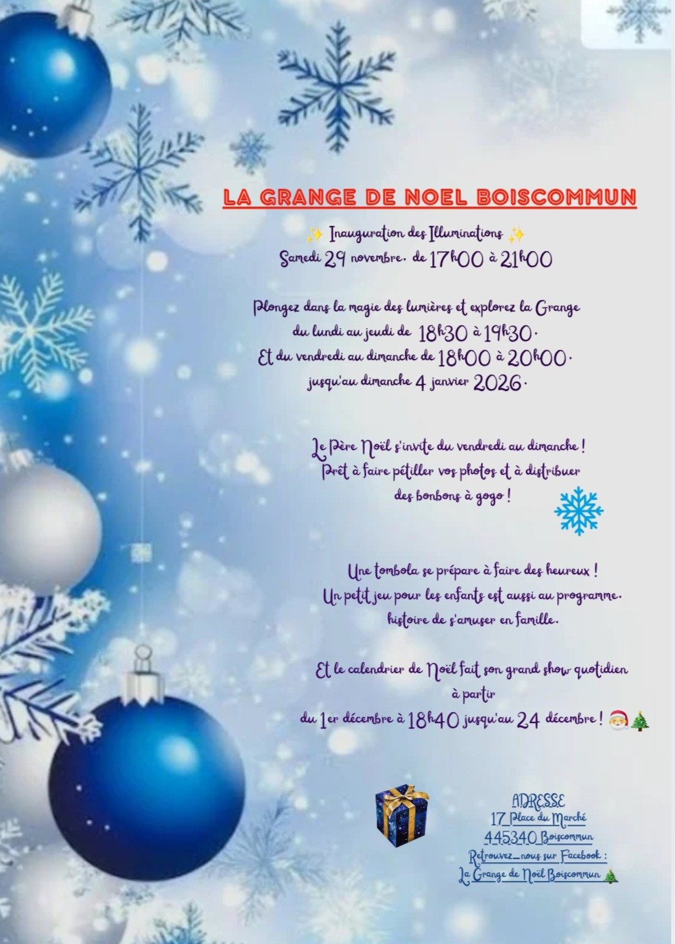 La Grange de Noël de Boicommun propose une animation féerique autour des illuminations de Noël, du 29 novembre 2025 au 4 janvier 2026. Installée place du Marché à Boicommun, la Grange est ouverte en soirée avec des décors lumineux, des animations pour les enfants, une tombola, un petit jeu familial et la présence du Père Noël les week-ends. Un calendrier de l’Avent animé est également proposé chaque jour du 1er au 24 décembre.