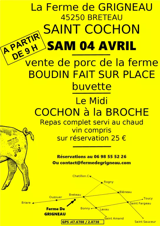 La Ferme de Grigneau vous invite à célébrer la Saint Cochon le samedi 4 avril à Breteau, à partir de 9h. Tout au long de la journée, découvrez la vente de porc de la ferme et assistez à la fabrication de boudin réalisée sur place, dans une ambiance conviviale et authentique. À l’heure du déjeuner, place au cochon à la broche, préparé sur place et servi chaud dans le cadre d’un repas complet, vin compris, proposé sur réservation. Une buvette sera également à disposition pour prolonger ce moment gourmand. Cette journée est l’occasion de rencontrer des producteurs locaux, de valoriser les savoir-faire agricoles et de partager un moment festif autour des produits du terroir. Réservation conseillée pour le repas du midi.