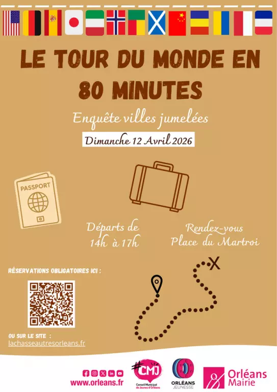 Pour célébrer la sortie de son livre sur les villes jumelées d’Orléans, le professeur Valise vous propose de suivre les traces de son voyage… en 80 minutes chrono. Avant le départ, il vous confiera un passeport de voyage. À chaque étape du parcours, un tampon attestera de votre passage dans l’une des 14 villes jumelées. Parviendrez-vous à compléter votre passeport ? Si vous revenez avec tous les tampons, le professeur Valise vous remettra un exemplaire dédicacé de son ouvrage. Une expérience gratuite, ouverte à tous : habitants d’Orléans comme touriste. Une façon originale de découvrir la ville tout en s’amusant ! Alors, rendez-vous le dimanche 12 avril 2026 avec un départ place du Martroi. Des départs seront proposés toutes les 15 minutes de 14h à 17h, seul ou en équipe de 6 per...