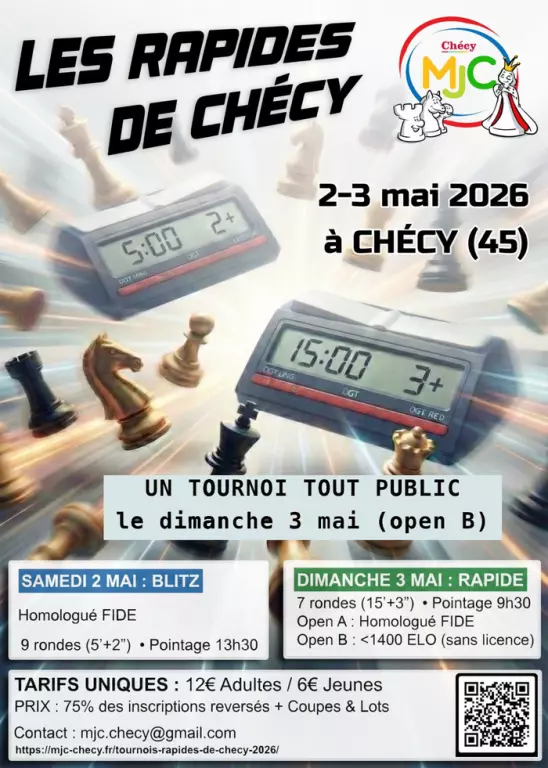 Deuxième édition des Rapides de Chécy, week end dédié aux échecs. **\- INEDIT : Cette année, un tournoi est réservé aux joueurs non classés ou non licenciés ! Un lot par participant, grâce à nos partenaires ! Attention, 40 inscrits maximum.** **\-- Deux tournois indépendants homologués par la FIDE** permettront aux joueurs de tous niveaux de s’affronter dans une ambiance conviviale et compétitive. **Buvette et restauration rapide sur place** **\----------------------------------------------------------------------------------** **Tournoi Blitz – Samedi 2 mai** **Tournoi homologué : licence obligatoire (prise de licence possible avec inscription)** **Cadence : 9 rondes en 5 minutes + 2 secondes par coup** **Pointage : à partir de 13h30** **Début de la première...