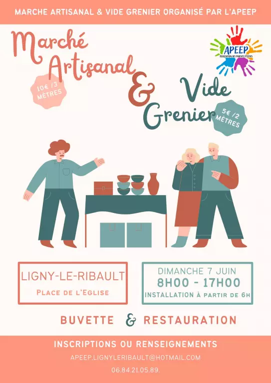 Marché Artisanal & Vide-Grenier ! 🎨🛍️ 📅 Dimanche 7 juin 2026 📍 Place de l'Eglise à Ligny-le-Ribault Artisans, créateurs, chineurs ou simples amateurs de bonnes affaires, cet événement est fait pour vous ! Venez exposer votre savoir-faire ou vider vos greniers dans une ambiance conviviale et chaleureuse 🌿 🔸 Places limitées – inscription obligatoire 🔸 Ouvert aux particuliers et professionnels 🔸 Une belle journée en perspective, riche en découvertes et en échanges 👉 Pour vous inscrire ou obtenir plus d’informations, contactez-nous en message privé ou à l’adresse suivante : apeep.lignyleribault@hotmail.com