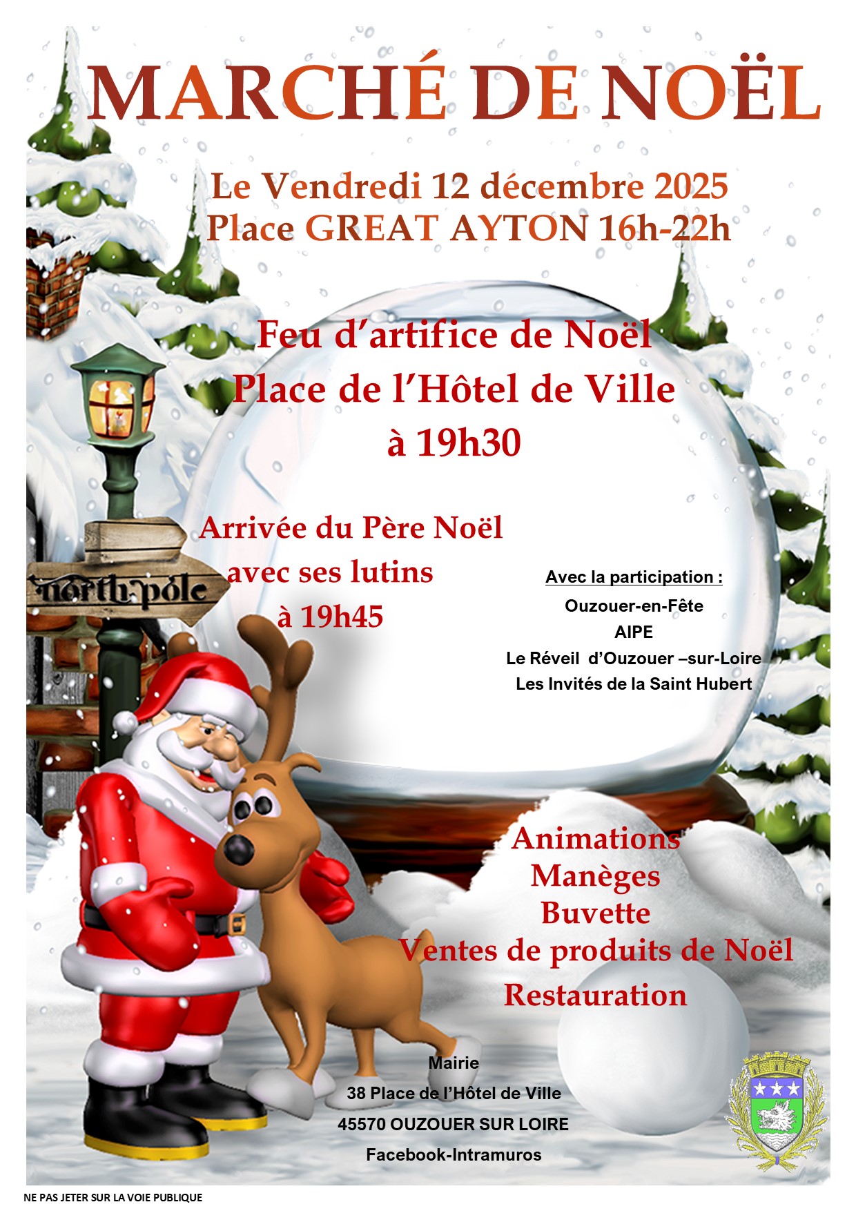 Animations, manèges, buvette, vente de produits de Noël, restauration - Feu d'artifice de Noël à 19h30 sur la place de l'hôtel de ville - Arrivée du Père Noël avec ses lutins à 19h45. - par la Municipalité - Avec la participation de Ouzouer en Fête, l’AIPE, le Réveil d’Ouzouer et les Invités de la Saint Hubert.