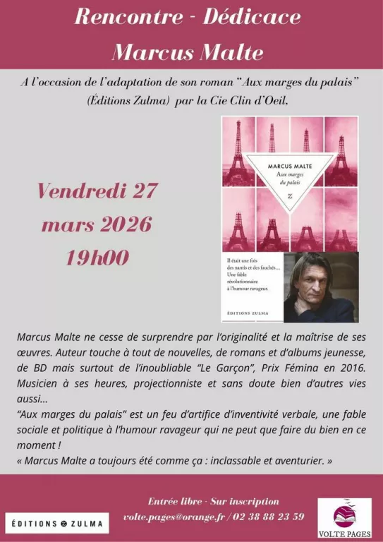 Marcus Malte nous présentera son roman "aux marges du palais". Il était une fois des nantis et des fauchés... Une fable révolutionnaire à l'humour ravageur aux éditions Zulma....