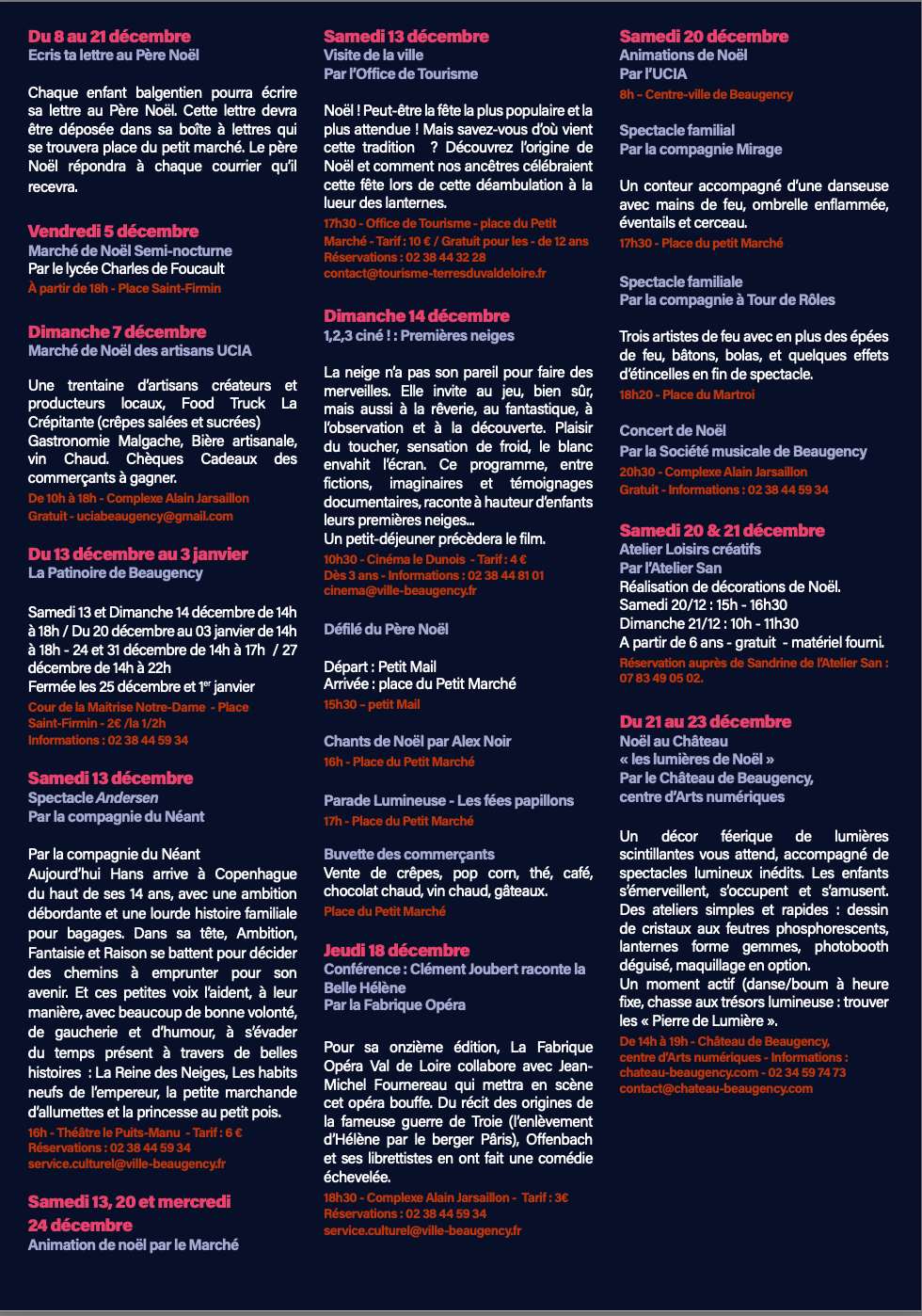 Du 5 décembre au 3 janvier 2026, de beaux événements sont proposés par la Ville de Beaugency : marché de Noël, patinoire, illuminations, concerts, parade lumineuse, cinéma, Noël au Château ! La fin d'année sera festive à Beaugency ! Le programme complet est disponible ci-dessous.