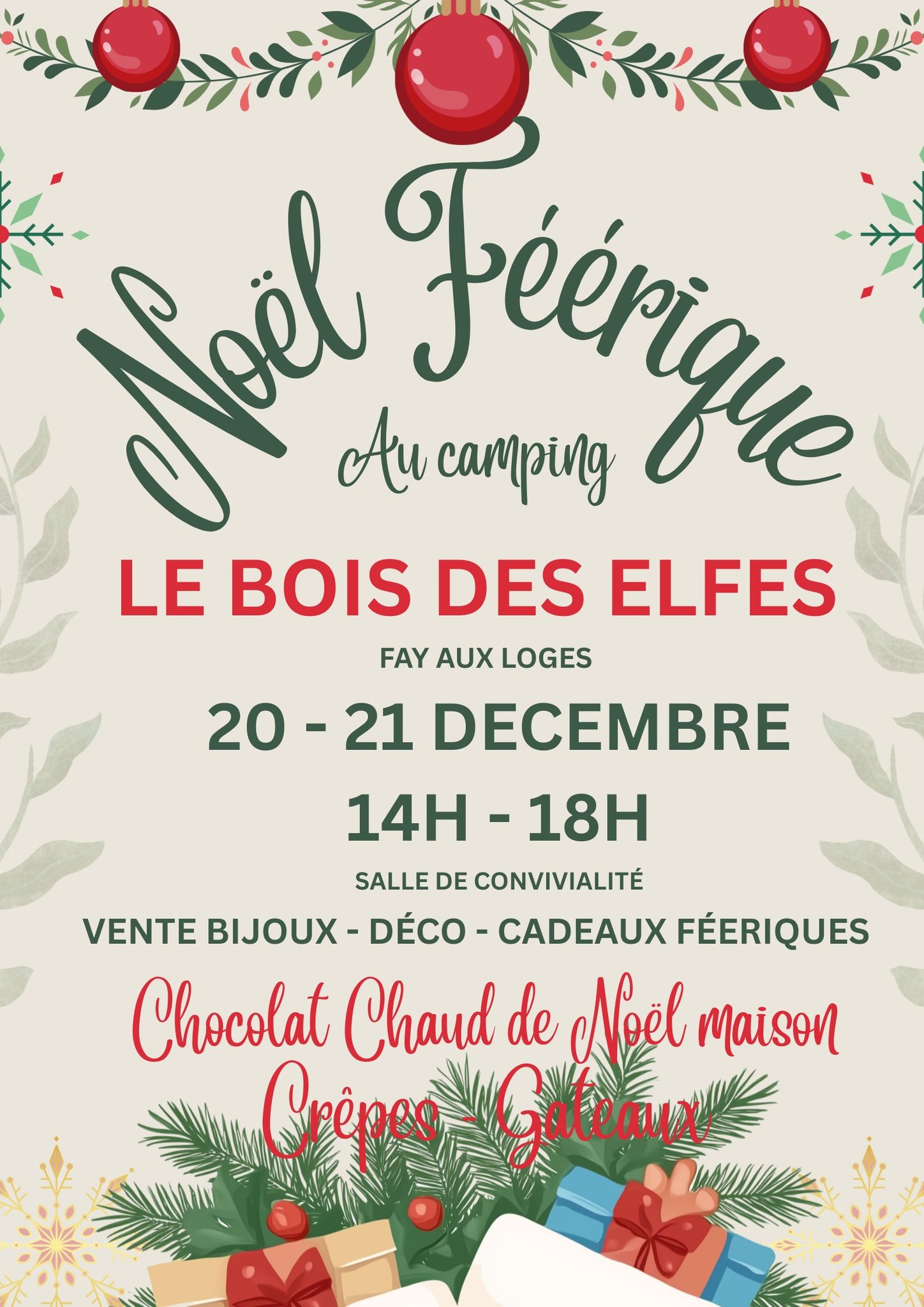 Le camping Le Bois des Elfes à Fay-aux-Loges invite petits et grands à vivre deux journées enchantées à l’occasion de son Noël Féérique, les 20 et 21 décembre de 14h à 18h. Dans une ambiance chaleureuse et conviviale, la salle du camping se transforme en véritable marché de Noël local, mettant en lumière des créateurs et artisans du territoire. Au programme : ✨ Vente de bijoux, décorations et cadeaux féériques 🍫 Chocolat chaud de Noël maison 🥞 Crêpes et gâteaux 🎁 Une atmosphère festive idéale pour préparer les fêtes tout en soutenant l’artisanat local. Un rendez-vous convivial et familial, parfait pour partager un moment magique au cœur du Loiret et découvrir les talents locaux.