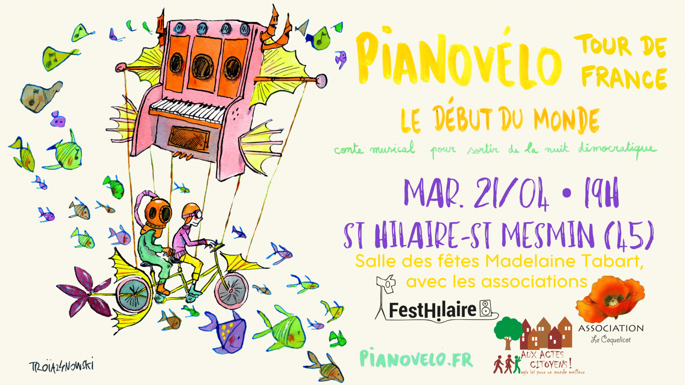 Philippe Séranne et David Aubaile font le tour de France à vélo en 150 étapes en tractant 250 kg de piano… L'un virtuose du verbe acéré, l'autre compagnon de route de Brigitte Fontaine, Salif Keita, Khaled et tant d'autres, ils jouent, chantent, amusent et surtout allègent l'immense accumulation de renoncement, de découragement, de frayeurs qui pèsent sur nos frêles épaules d'êtres conscients et réalistes face à l'avenir. Des paroles fortes qui sonnent juste, et surtout la joie qui emporte le désespoir et ouvre une fenêtre de liberté dans nos quotidiens assoupis... Un spectacle qui regonfle les mollets et le moral ! Spectacle à 19h Accueil à partir de 18h30 Temps convivial autour d’un verre après le spectacle