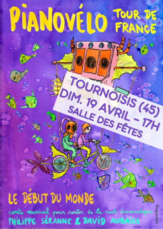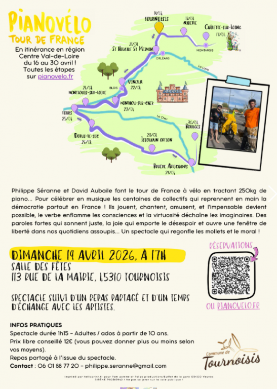 Philippe Séranne et David Aubaille font le tour de France à vélo en tractant 250 kg de piano... Pour célébrer en musique les centaines de collectifs qui reprennent en main la démocratie partout en France ! Ils jouent, chantent, amusent, et l'impensable devient possible, le verbe enflamme les consciences et la virtuosité déchaîne les imaginaires. Des paroles fortes qui sonnent juste, la joie qui emporte le désespoir et ouvre une fenêtre de liberté dans nos quotidiens assoupis... Un spectacle qui regonfle les mollets et le moral! Spectacle de 1h15 pour adultes/ados Prix libre conseillé 12€ (vous pouvez donner plus ou moins selon vos moyens) Repas partagé à l'issue du spectacle.
