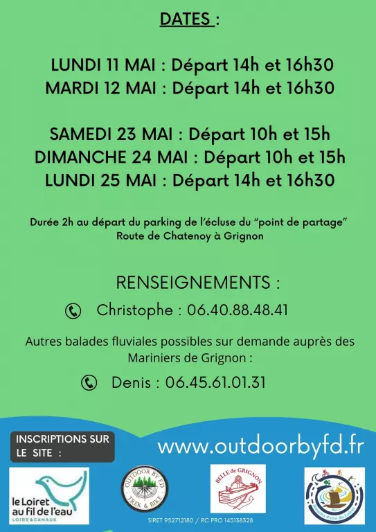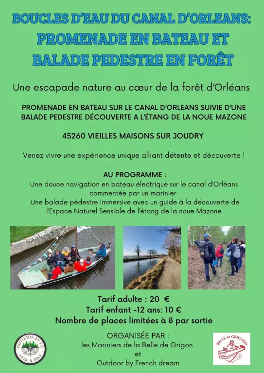 Boucles d'eau du Canal d'Orléans. Promenade en bateau et balade pédestre en forêt à l'étang de la Noue Mazone. Balade en bateau électrique sur le Canal d'Orléans commentée par un marinier. Puis balade pédestre immersive avec un guide à la découverte de l'espace naturel sensible de l'étang de la Noue Mazone. Tarif adulte : 20€, enfant de moins de 12 ans : 10€. Nombre de place limitée à 8 par sortie. Durée 2h. Départ du parking de l'écluse du "point de partage" Route de Chatenoy à Grignon". Renseignements : Christophe au 06 40 88 48 41 ou inscription sur le site www.outdoorbyfd.fr . Attention : horaires de départ différents selon les jours.