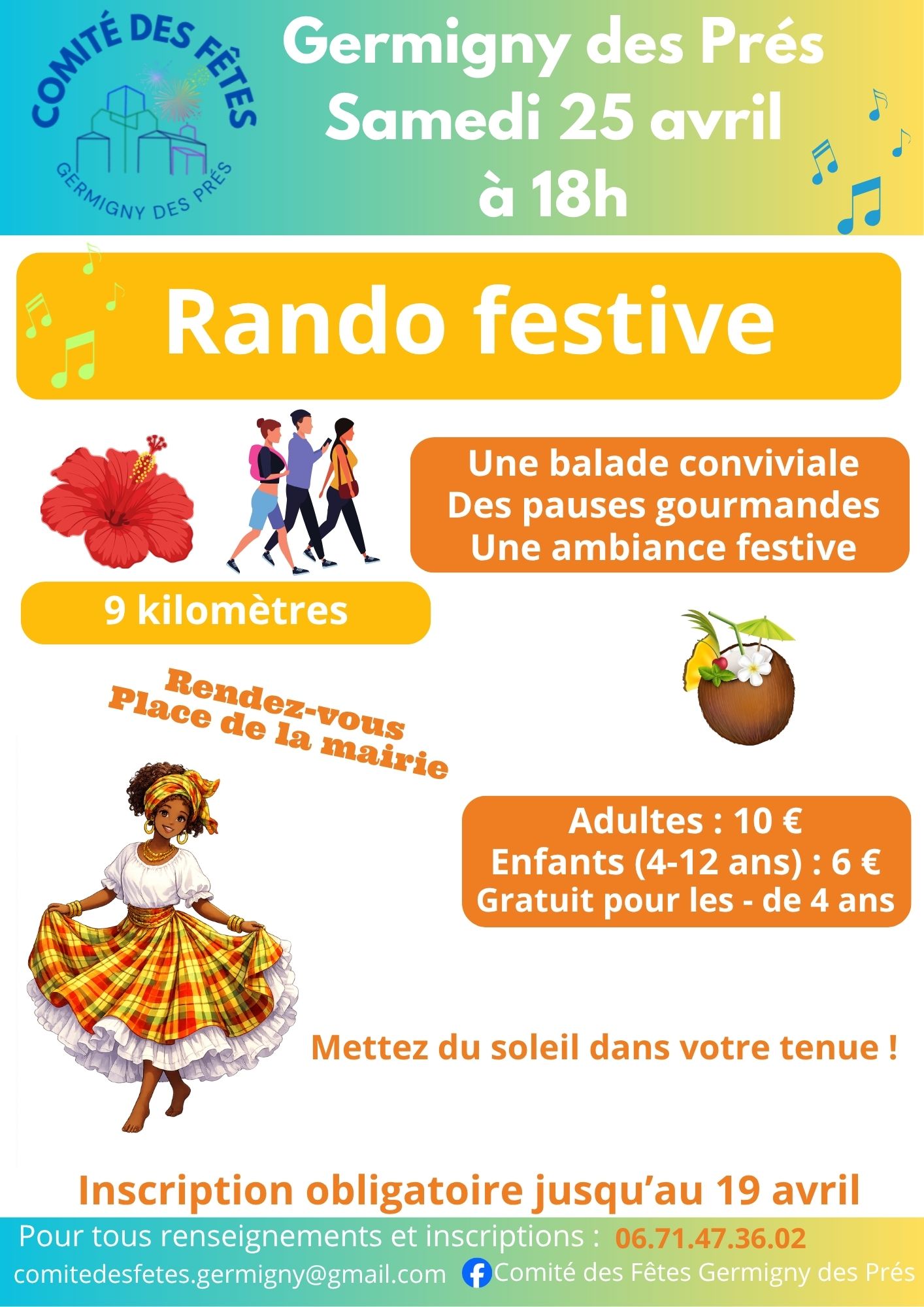 Une rando de 9 kilomètres dans un esprit festif, convivial et décalé avec de nombreuses surprises tout au long du parcours pour faire la fête ! De la musique live, des jeux musicaux et une soirée dansante avec des étapes gourmandes autour d’un apéro dinatoire fait maison. Cette année, la rando festive sera antillaise, alors n’hésitez pas à enfiler une tenue ensoleillée ! Vous souhaitez passer un moment convivial en famille ou entre amis et profitez de musique live, de danse, d’animations musicales, la rando festive est faite pour vous. Inscription obligatoire avant le 19 avril. - Par le comité des fêtes -