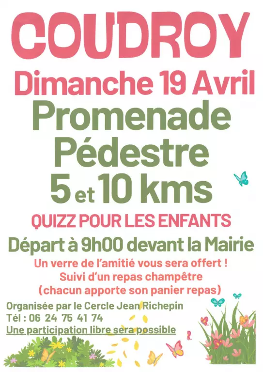 Promenade pédestre 5 et 10km. Quizz pour les enfants. Départ 9h devant la mairie. Verre de l'amitié offert suivi d'un repas champêtre (chacun apporte son panier repas). Tel. 06 24 75 41 74