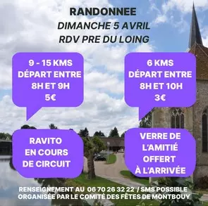 Randonnée. Pour la rando de 6km : départ de 8h à 10h, tarif 3€. Pour la rando de 9-15kms départ de 8h à 9h, tarif 5€. Ravitaillement. départ au Pré du Loing (ancien camping). Verre de l'amitié offert à l'arrivée.