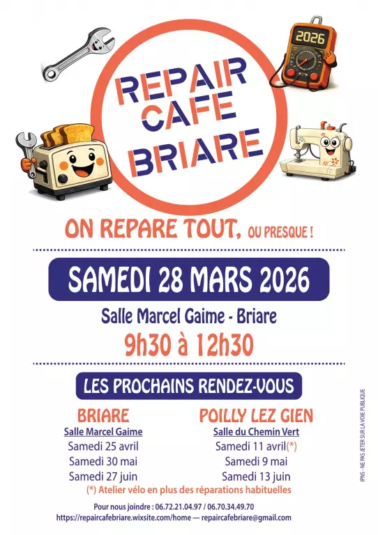 Le Repair Café de Briare vous donne rendez-vous le samedi 28 mars 2026 de 9h30 à 12h30 à la salle Marcel Gaime. Venez avec vos objets du quotidien en panne ou abîmés : petit électroménager, appareils électroniques, vêtements ou autres équipements. Sur place, des bénévoles vous accompagnent pour diagnostiquer, réparer et prolonger la durée de vie de vos objets. Au-delà de la réparation, c’est un moment d’échange et de partage de savoir-faire, accessible à tous. L’objectif : apprendre à réparer soi-même, réduire les déchets et adopter une consommation plus responsable. Une initiative conviviale et engagée, ouverte à tous, pour donner une seconde vie à vos objets tout en passant un moment utile et solidaire.