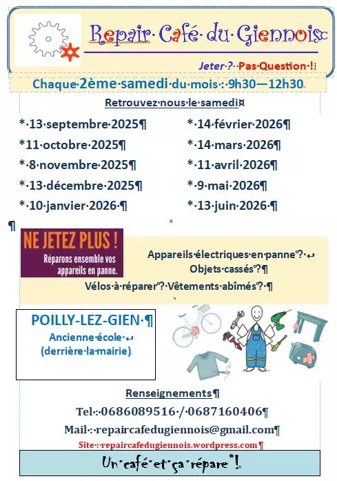 Le Repair Café vous accueille dans l’ancienne école située derrière la mairie de Poilly-lez-Gien lors de plusieurs dates dans l’année. Le principe est simple : réparer ensemble. Des bénévoles mettent à disposition leurs outils et leurs compétences pour vous aider à réparer différents objets du quotidien : vêtements, petits appareils électriques, vélos, meubles, jouets ou encore vaisselle. Apportez un objet à réparer et profitez d’un moment convivial pour apprendre, échanger et donner une seconde vie à vos objets. Un café ou un thé est souvent proposé pour partager ce moment dans une ambiance chaleureuse.
