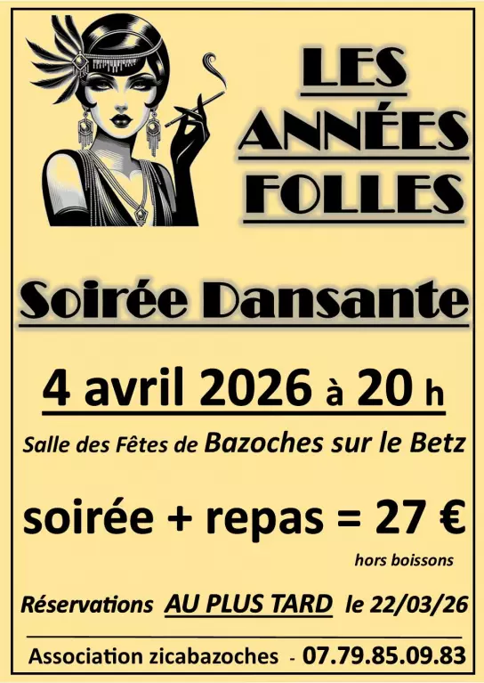 L'association ZicaBazoches organise un repas dansant portant sur le thème des années folles, avec des musiques allant des années 20 à nos jours ! Vous êtes invités, sans obligation, à vous présenter en tenue d'époque.