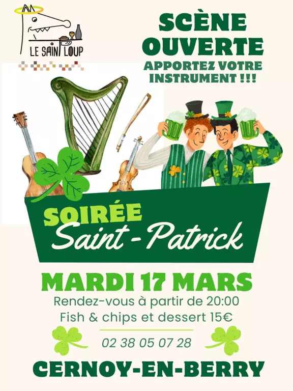 Célébrez la Saint-Patrick dans une ambiance festive et conviviale au restaurant Le Saint Loup à Cernoy-en-Berry ! Le 17 mars, repas-concert animé avec scène ouverte. Savourez des plats généreux et savoureux, spécialement concoctés pour l’occasion, tout en profitant de cette atmosphère chaleureuse et festive. Que vous veniez en famille, entre amis ou en couple, préparez-vous à passer un moment unique entre musique, bonne humeur et gastronomie. Les places sont limitées, alors pensez à réserver dès maintenant au 02 38 05 07 28