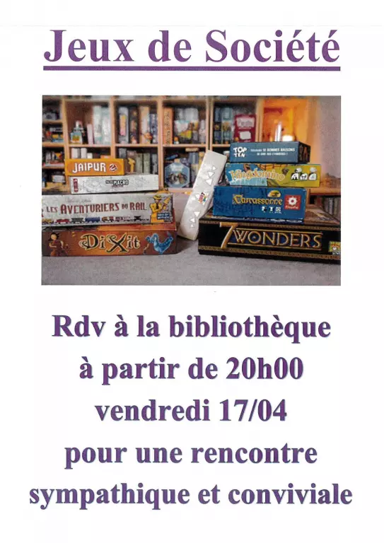 Envie d’une soirée ludique et conviviale ? Rejoignez-nous à Bonny-sur-Loire le vendredi 21 février à partir de 20h à la bibliothèque pour une grande soirée jeux de société ! Que vous soyez amateur de stratégie, de coopération ou de jeux d’ambiance, il y en aura pour tous les goûts et tous les âges. Plongez dans des univers variés, découvrez de nouveaux jeux ou redécouvrez les classiques en famille ou entre amis. Une occasion parfaite pour partager des moments de détente et de rire dans une ambiance chaleureuse. Novices ou passionnés, tout le monde est le bienvenu ! Venez tester, jouer et profiter d’une soirée placée sous le signe de la bonne humeur. À bientôt autour d’un plateau de jeu !